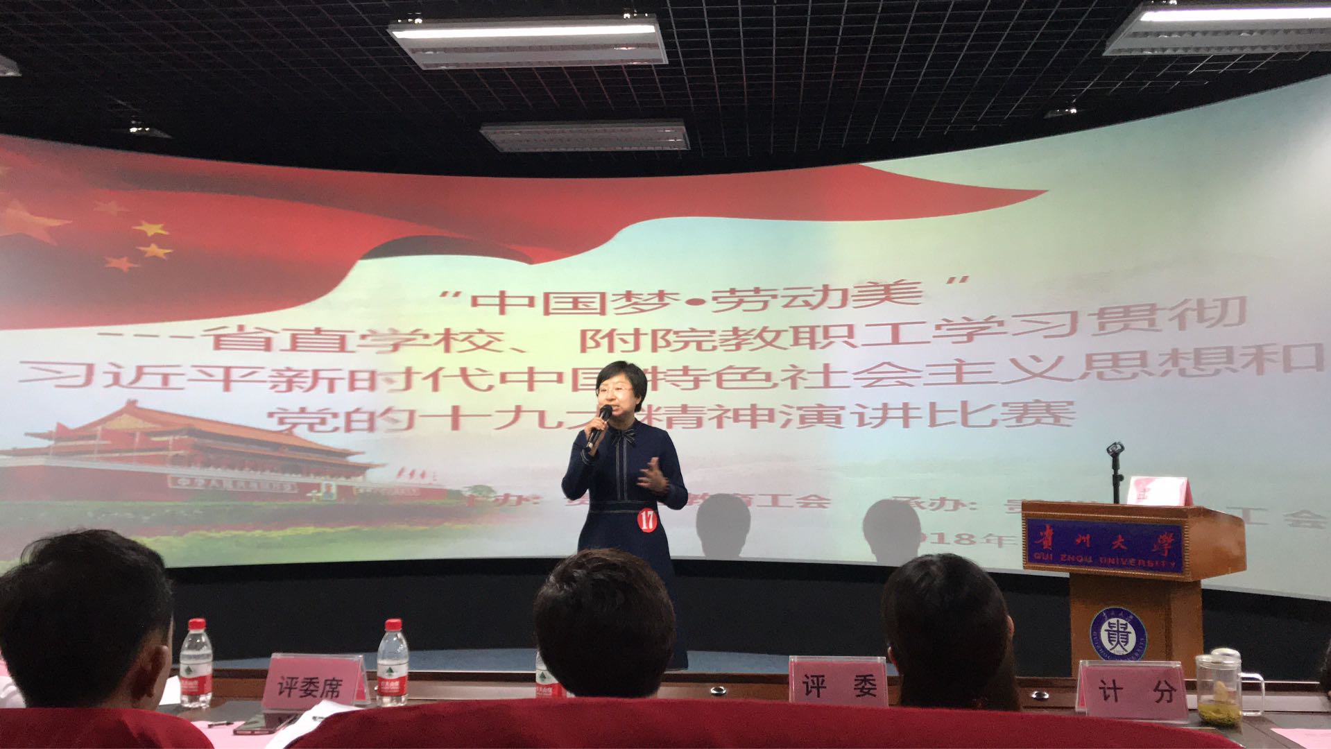 为进一步推动习近平新时代中国特色社会主义思想和党的十九大精神下基层、进学校、进附院,把学习宣传贯彻工作往实里走、往深里走、往心里走,让广大职工在思想上领会、情感上认同,始终坚定不移听党话、跟党走,为实现全面同步小康,开创“百姓富、生态美”多彩贵州新未来,夺取新时代中国特色社会主义伟大胜利,实现中华民族伟大复兴的中国梦,由省教育工会主办,贵州大学工会承办的“中国梦·劳动美”——省直学校、附院教职工学习贯彻习近平新时代中国特色社会主义思想和党的十九大精神演讲比赛于5月22日在贵州大学北校区慎思楼情景模拟实验室隆重举行。