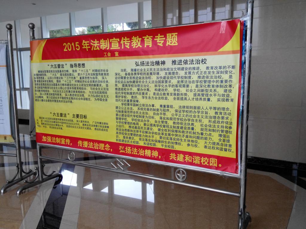 本次法制宣传活动是根据省教育工会转发《关于做好2015年全省工会法制宣传教育工作的通知》的通知要求开展的,工会采取了设置宣传栏、发放宣传资料、学习相关法律法规等多种方式开展。工会在行政楼大厅设置了宣传栏,并在学校每个部门发放法制宣传资料近200份,为了达到宣传效果,使教职工能方便学习相关法律法规,工会还在二级网站上传了相关法律法规并下发通知安排学习宣传。