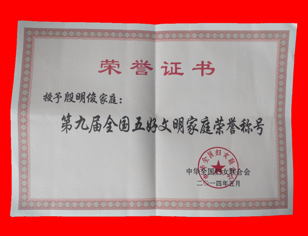 我校此次第九届全国五好文明家庭推荐工作由工会负责,工会及时做好在全校范围内的推荐工作。经过推荐评选,学校上报推荐殷明俊家庭为全国五好文明家庭。经省妇联、全国妇联层层推荐审核,我校殷明俊家庭荣获第九届全国五好文明家庭荣誉称号。