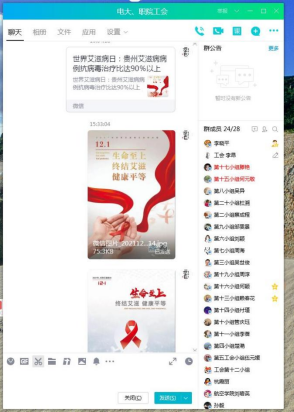 工会在我校工会QQ群中分享艾滋病预防知识,促进艾滋病防治宣传教育走进教职工中,普及预防知识和技能,引导广大教职工践行社会主义核心价值观,树立“每个人是自己健康第一责任人”理念,提高防治意识和自我防护能力。